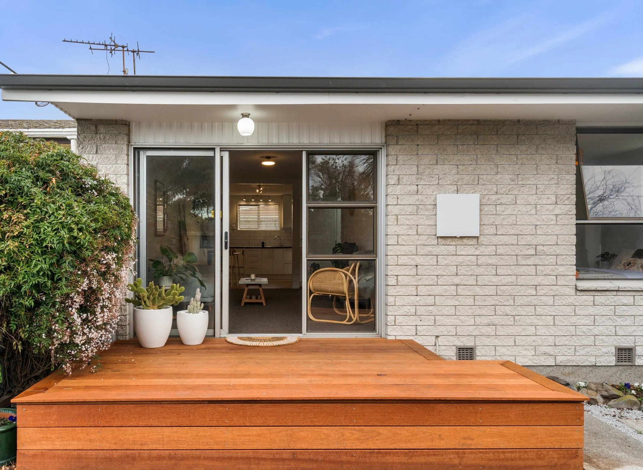 A new deck was added to the front entrance of this property, complete with integrated steps for easy access. Positioned to capture the sun, the deck creates a welcoming entry and a practical outdoor space for entertaining.